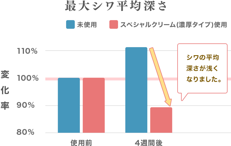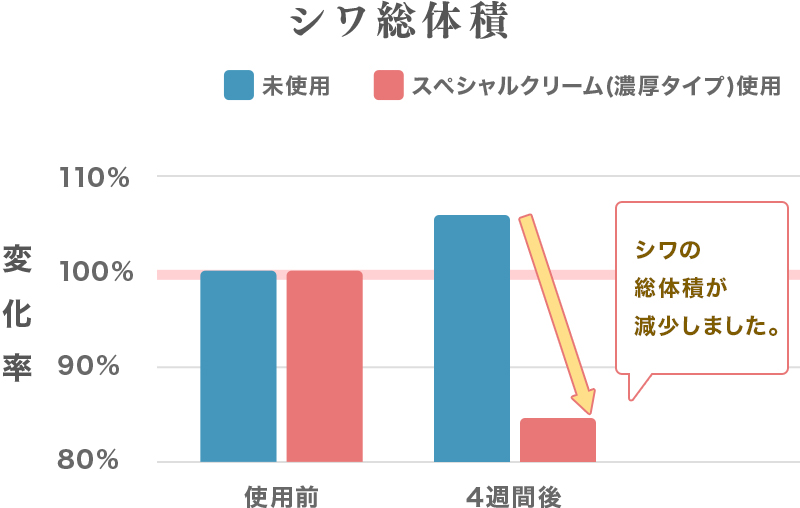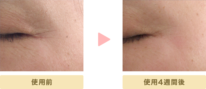 4週間の効能評価試験で、目尻の最大シワ平均深さが11%、シワ総体積が15%改善したという結果がでました。