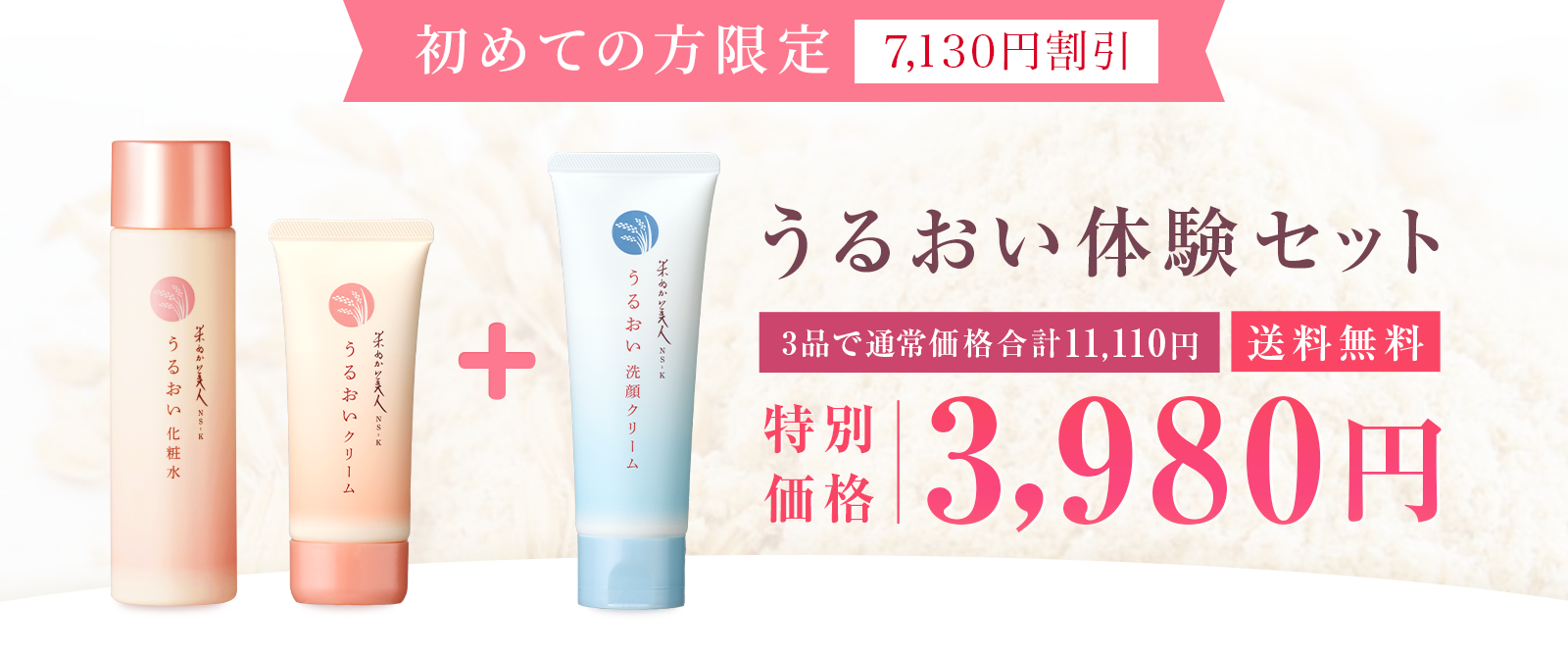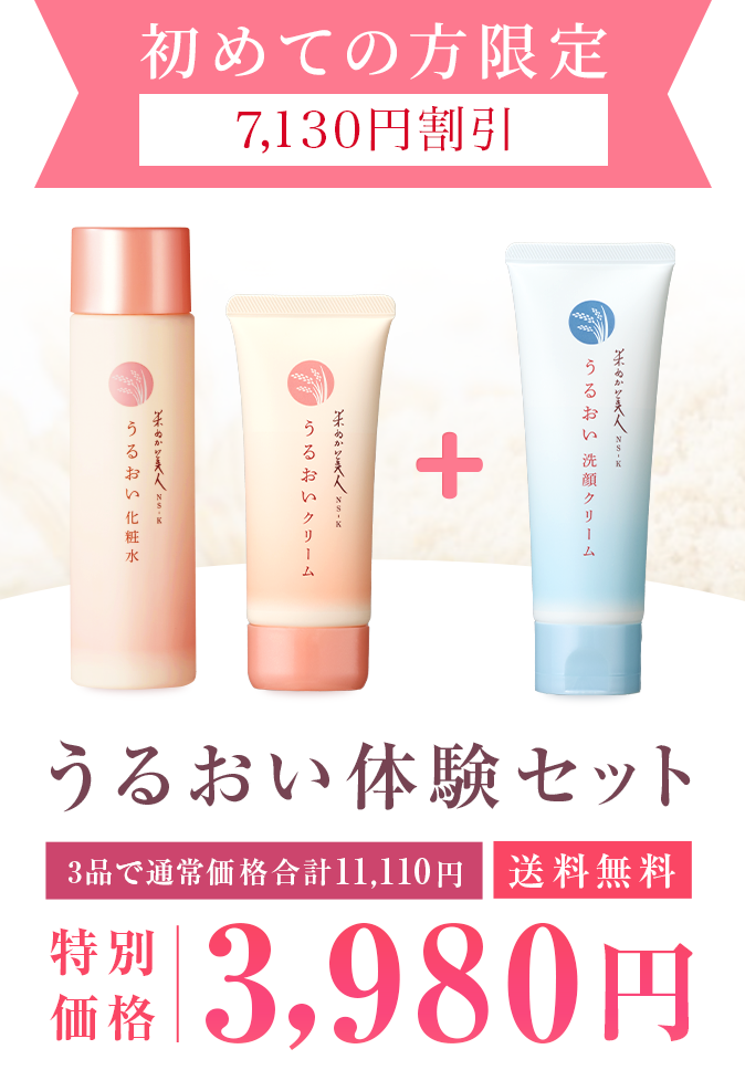 ・うるおい化粧水(200ml)3,850円、うるおいクリーム(60g)4,950円、うるおい洗顔クリーム(100g)2,310円
